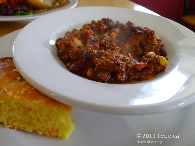 I know some people take chili con carne very seriously. I know there are very strong opinions about what ingredients belong (or don’t belong) in this spicy stew. I am not going to get into that mess of a conversation. Hat Creek Ranch’s bison chili bears bold deliberate flavours. The serving is piping hot, filling and comforting. The spice mix tastes familiar; the mixture tastes a lot like the chili DL makes. A yellow wedge of homemade crumbly corn bread is the most appropriate side-kick to stew.