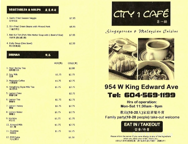 I am in Vancouver for several days attending a conference for work. I’m hankering for some Hainanese Chicken Rice. I also want some bubble tea when I’m done, so I set my sights on City 1 Café on the corner of Oak Street and King Ed. City 1 Café is conveniently kitty corner to Dragon Ball Tea House.