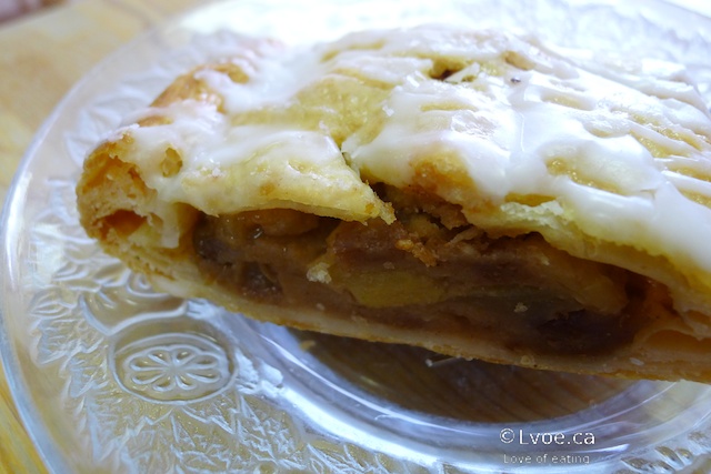 This strudel slice is stuffed full of cinnamon-y apples. There are golden sultanas mixed in there too. Although I’m not a big fan of raisins, I still enjoyed this chubby slice.