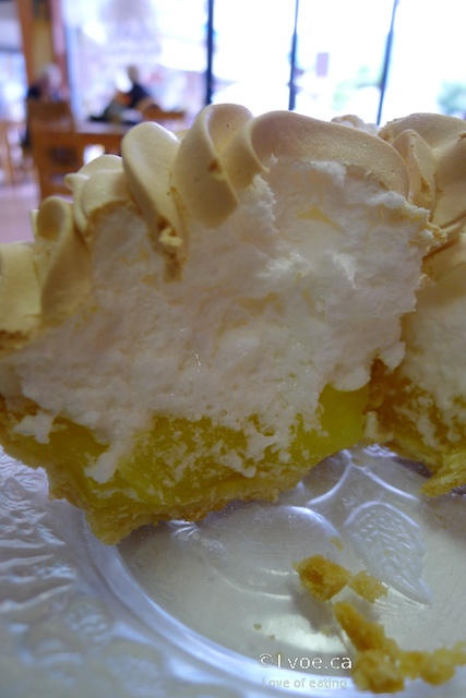 The mountainous meringue looks so tempting in the display case, I have to try one. As a whole this tart is very sweet. The custard did not look homemade. It is artificially fluorescent day-glow yellow and translucent. The filling has more of a Jell-O texture rather than a custard texture. The meringue, although eye catching, is sticky and cloyingly sweet.