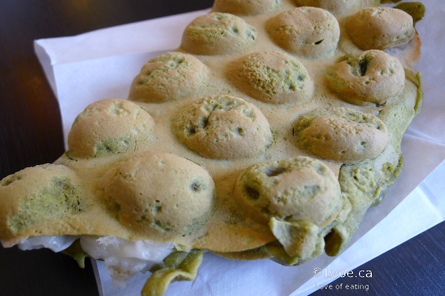 It’s also called a bubble waffle. The simple sweet dough is prepared much like a regular waffle on a specialized griddle to give the hollow poufy texture. I like these best hot off the waffle iron and plain jane, but Bubble Queen has some pretty tempting filling choices. The green tea-ness is subtle; with just enough matcha flavour without being overwhelming. The mochi makes this very filling.