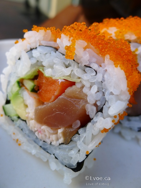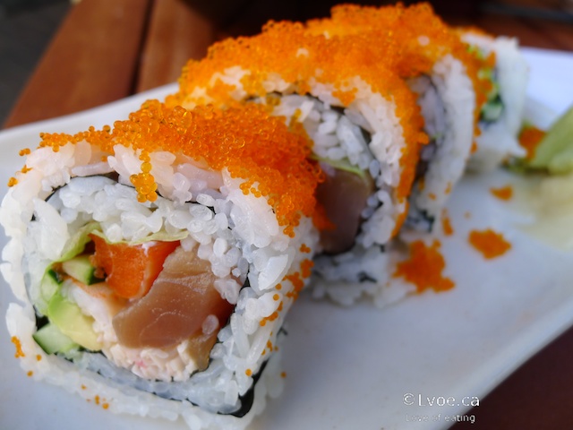 The Taiyo House roll appealed to me at the time of order, because it I couldn’t decide what I wanted in a maki today. The Taiyo rolls has Tuna, salmon, ebi, crab, avocado and tobiko covered; since it has five different seafoods in one roll, I figure it’d be the logical choice.