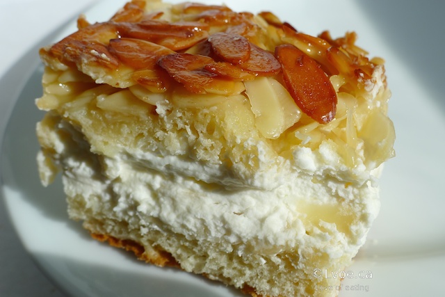 My favourite part of this whipped cream filled Bee Sting slice is the toasty baked almond topping. So aromatic!