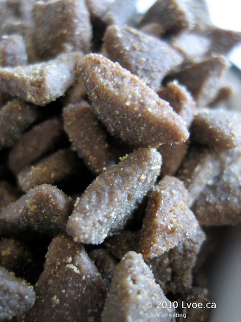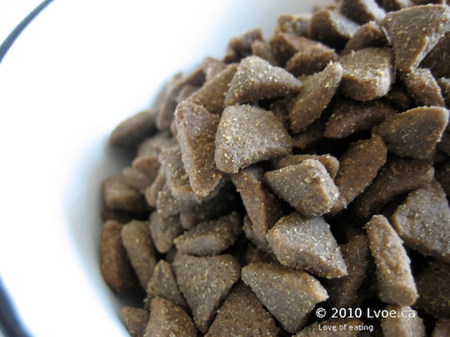I don’t know if she likes it any more or less than other dry kibble she’s had in her lifetime, but her coat is by far shinier than it has ever been. The actual size of the morsels are slightly smaller than some of the other brands we've tried over the years and I've noticed not as many broken pieces fall out of her mouth while she's crunching away. This makes for less clean up for me. There's literature that says animals will eat less when there’s more “quality protein," because they will become satiated with the protein versus the filler products in the food. I haven’t noticed this difference in my beast; she eats just as much Orijen as she did her Iams. She’s a bit of an oinker however, and gets visibly stressed when she can see the bottom of her bowl.