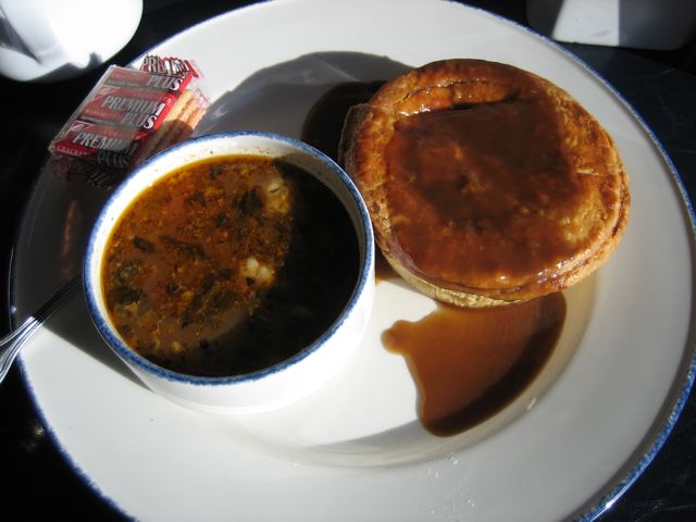 Mmmmm...meat pie. The potato pastry was flakey tender on the sides and bottom, but it was a tad thick and hard on top. When I went at it with my fork it just schmooshed the meaty filling out the bottom. The ground beef was mild in herbs and spices; in fact the pie was mild all around. The mildness of the tourtière paired nicely with the quick fire spice of the minestrone. Meat pie,... such a comfort food.