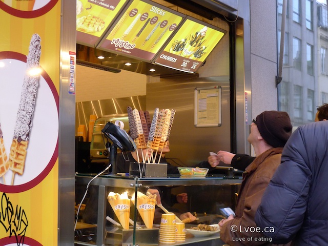 You have to wait a few minutes as the churros are fried at the time of order. The server then tosses them into a paper cone, adds a granular sugar and your choice of toppings. I choose dark chocolate and nuts for one serving, and milk chocolate with nuts for the other. Hot n’ crispy.
