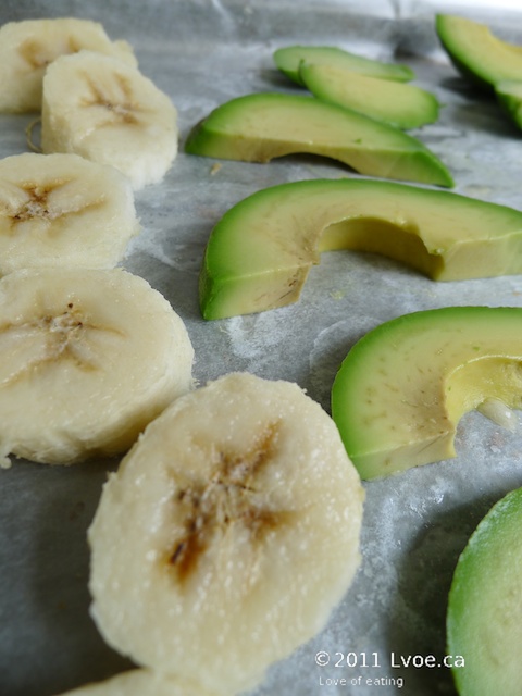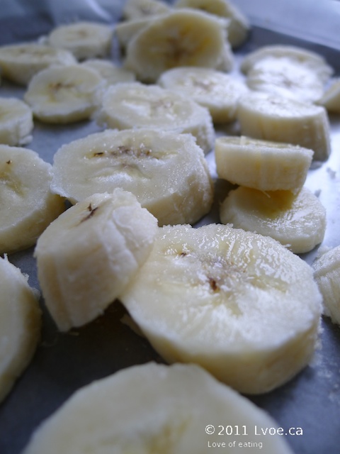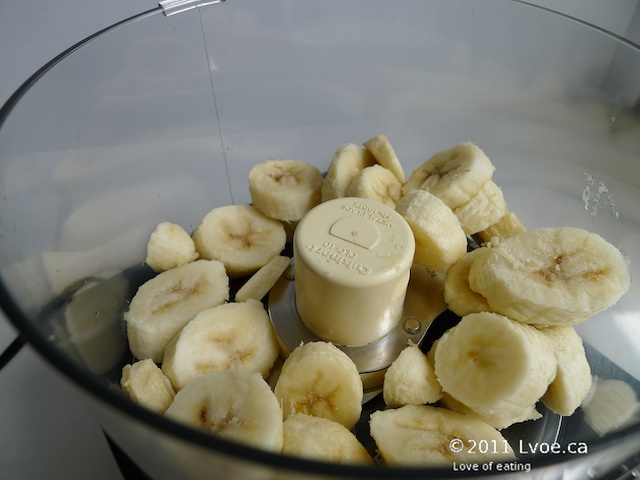 First: Peel and slice bananas approximately 1cm in width. Or in a size that your processor can handle. Spread, one layer thick on a wax/parchment lined cookie sheet. Place in freezer. Wait impatiently.