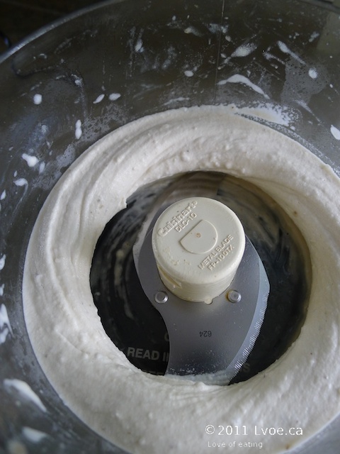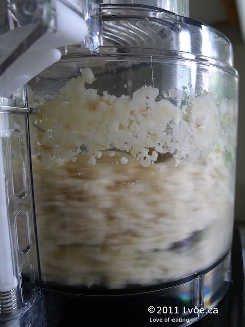Third: When it’s whizzing around the processor, eventually the banana will start to mound up. Now is a good time to stop the machine and trickle in the liquid and a dash of vanilla. Only trickle in a little liquid at a time. You only want enough liquid to get the blades unstuck and moving again. For two or three bananas it may require only a tablespoon or so of soy-milk. If you put in too much liquid, the dessert will lose its thick "ice cream" texture. This is also a good time to go in with a rubber spatula and help distribute the banana more evenly around the bowl.