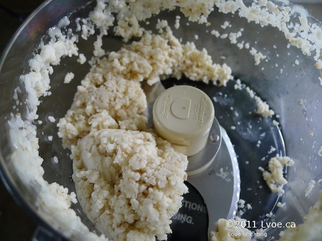 Fourth: Continue to whizz frozen fruit around. Soon the bananas will mound up again in a ball. Instead of adding more liquid, stop the processor and try to break the banana-ball up with your rubber spatula, while scraping the sides and re-distributing the frozen mass again.