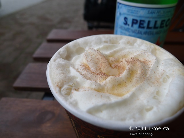 Standard Da Vinci flavoured latte, with organic espresso. It’s a damp summer morning, and this sweet pick me up is just what I needed. Like all syrupy drinks the sweetness gets a bit to concentrate for me towards the bottom. I anticipate this sugariness, so that’s what the Pellegrino is for.