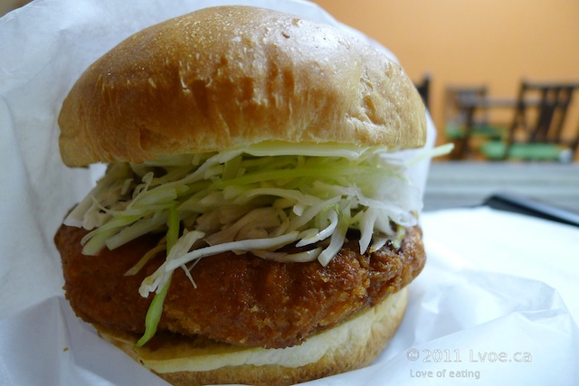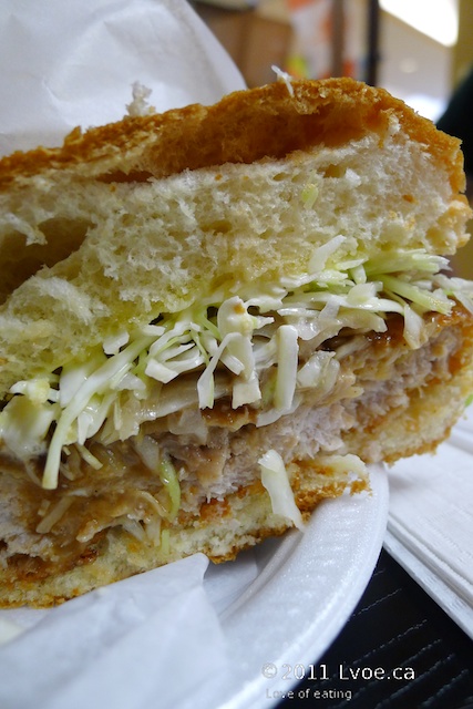 Cute little pig burger, no? I love the curvature of the domed bun and the thick patty that perfectly fits the circumference of the bread. The breaded pork cutlet is topped with a generous helping of slaw. The meats that require deep fry are just fetched from the hot oil bath. This makes for a hot and crunchy white meat patty in a bun. Compared to the other two burgers, the pork may seem a little drier. The combination of breaded pork and slaw made this a favourite at our table. A simple unadulterated katsu burger.