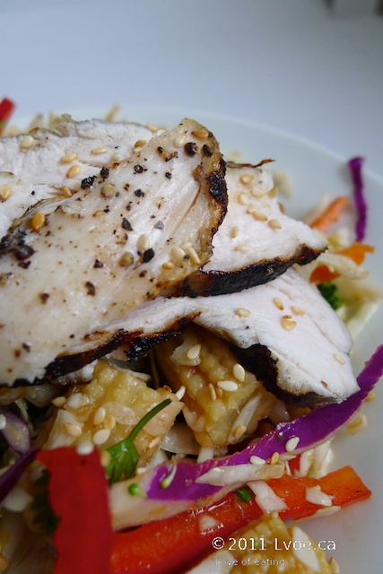 After tossing the salad in dressing, I plate the serving and add the grilled chicken with a pinch of sesame seeds.