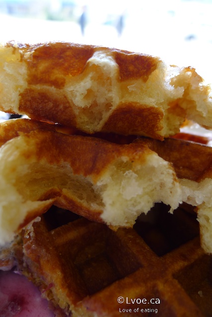 Here we have the original vanilla waffle and a caramel waffle. The caramel waffle has little chunks of caramel throughout, and is slightly sweeter than the vanilla. Damn, these are good waffles. They are crispy on the outside, but thick, soft and chewy on the inside. The crispiness on the outside makes the waffle hold up to any kind of condiment. No issues with sogginess.