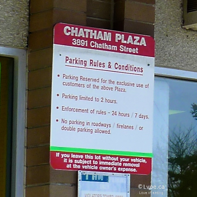 According to Chatham Plaza’s own signage, the customer parking in this strip mall is two hour parking for people patronizing the businesses in the plaza. We, obviously, are happy customers of Damien’s Belgian Waffles today. However, the overzealous neighbouring convenience store person assumes we are not, and slaps this on my windshield while I am scooping whipped cream onto my Liège waffle: