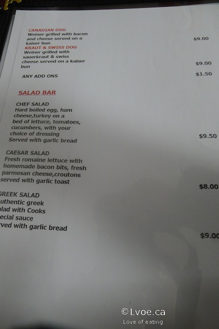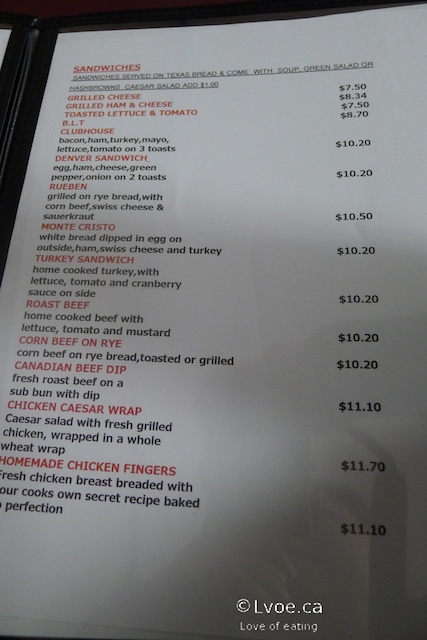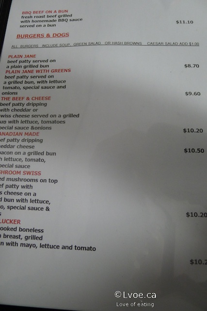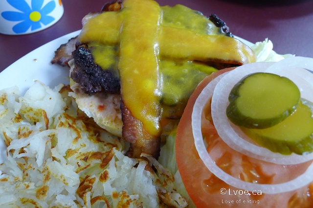 The burger patty appears to be hand formed, and tastes beefy. It’s not a “juicy” burger, but not dry either. Track Side Diner also uses a thousand island-type burger sauce, which adds a bit of tang and moisture to the Canadian Made. I like that they use cheddar cheese, and the bacon is easily bite-able. The patty sandwich has good all-around flavour for a basic burger. The burgers come with a choice of soup, hash browns or salad.