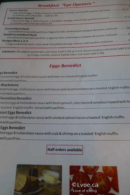 Our server offers the bar drink special today, a Caesar. Tempting, but it is barely 11:00am. I stick with coffee and juice. This colourful beverage is layered with orange juice, grapefruit juice then topped with a hit of cranberry juice. Fun and refreshing. The orange and grapefruit juices are fresh squeezed, which is a nice touch.