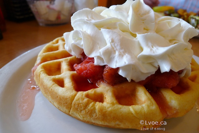 This is more of a soft cakey waffle than a crispy-outside-soft-inside waffle. The thick waffle readily soaks up the strawberry without becoming soggy all the way through. I prefer waffles slightly crispier on the outside, but this waffle does the job as a sweet ending to a hearty diner breakfast.