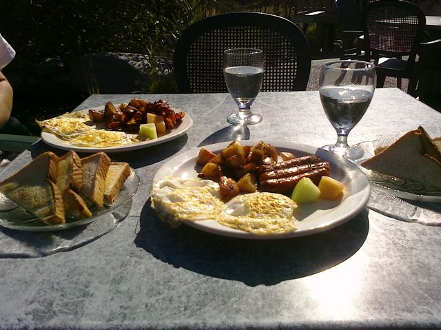 The Cutting Board is part of the Kumsheen Rafting Resort located about 5km north of Lytton, BC. I'm suprised I'm blogging about this place as I had boycotted them due to poor service about 4 years ago*. Yeah, I can hold a grudge. Well it's 2010, and I found myself in the area and hungry. It was early enough in the day that they would still be serving breakfast, so we decided to give it another go. C'mon it has been four years; and there's been turn over in staff since then, so the service must be better...