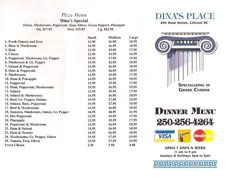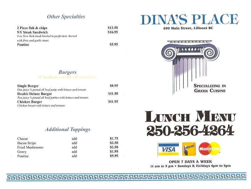 There are certainly some diehard fans of Dina’s Place Restaurant. In fact, it was a diehard colleague that told me about Dina’s years ago. One time, this Dina’s Devotee insisted we eat at the Lillooet location and then eat at the (now defunct) Ashcroft location. And we did. Please, if you are not familiar with the distance between these two communities: Google Map it. It was a long day drenched in tzatziki.