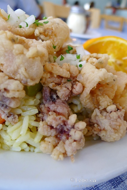 This is pretty decent. The rings and tentacles are lightly battered and are not greasy. Looking around the room, this looks like a popular menu item. It seems every table has a squid-y dish in either the appetizer or meal form. The kalamari is served with Greek salad, rice, and pita bread.