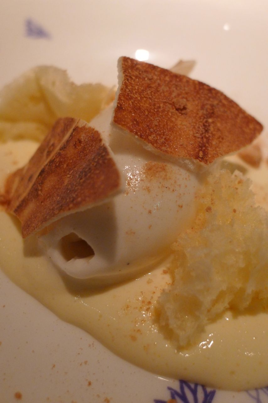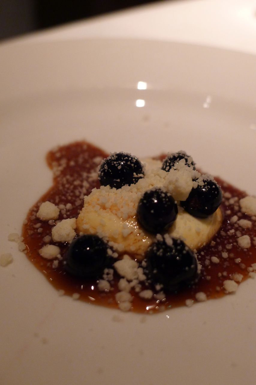 This is the pre-dessert tonight. These are tiny frozen crowberries crowning mascarpone cheese and a liquorice reduction syrup. I have no idea what the white crunchy bits are, but they add a texture contrast that makes this fun to eat.