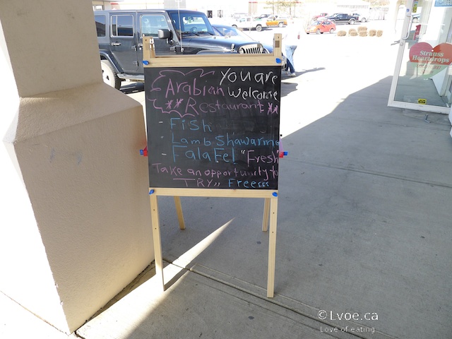 The Arabian Restaurant is attached to the Chop n’ Block. It's a few doors down from Sweet Spot Cupcakes and across from Gourmet Greens. (The Chop n’ Block was formerly known as Keely’s Chop n’ Block, then it was Murphy's Chop n' Block. Now I'm not sure, so I'm just going to call it the Chop n' Block.) A wall was removed, and the meat store expanded into the neighbouring retail space. The Arabian Restaurant occupies a part of the new space.
