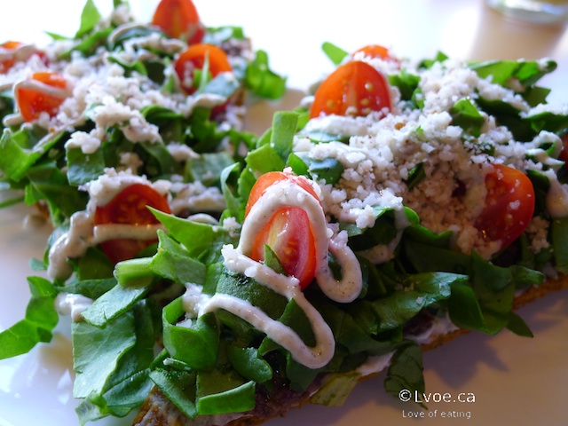 The “crust,” in this case, is nutty and hearty; it’s like a soft pressed cracker/thin bread type thing. The extra “dressing” drizzled on top is a cashew based ranch dressing and Brazil nut “parmesan.”