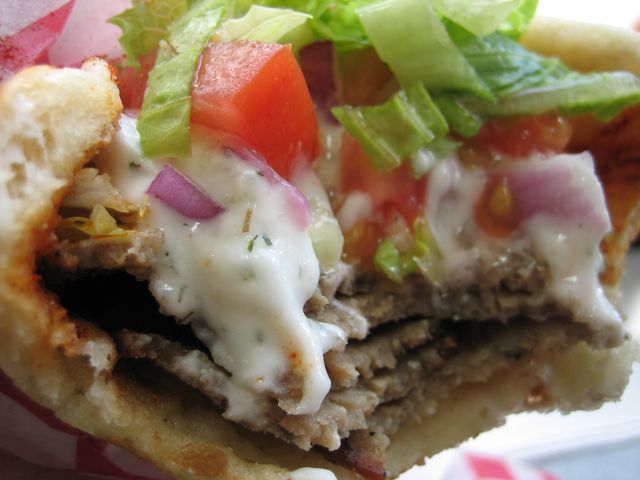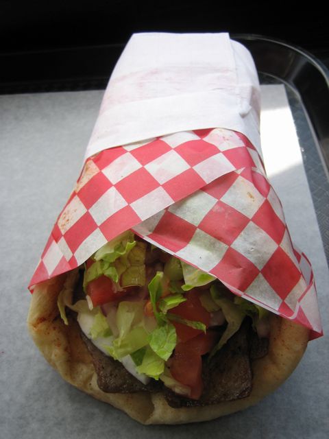 Back in my clubbing days, when I lived in the UK, very few places would be open after my friends and I left the clubs, but the gyros and shawarma places were always ready to serve. I remember we referred to them as "kebabs," and we had them fairly regularly in the wee hours of the night/morning. When I was in France I remember ordering a similar thing in Paris' Latin Quarter, but it was wrapped on a bed of frites. All good eats by my recollection. I haven't had gyros again, until today at Donair Express, and I've never had it with this Halifax born "sweet sauce."