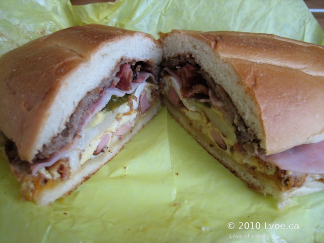 I got the Real Madrid because my eyes caught the words head-cheese and I was convinced I needed it. Later I realized that many of their signature tortas had head cheese in them. In between the bread there are: sliced hotdogs, pork sausage, eggs, bacon, ham, head cheese, breaded steak, a variety of cheeses (including mexican fresh cheese), tomatoes, onions, jalapenos and avocados. Ingredients for several meals in one hand-held piece of heaven? How can I not love that?