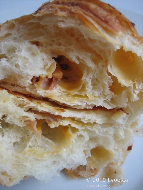 This large croissant is pretty flakey and buttery. The ham and cheese part is a tad scant. There is some cheddar and what looks to be standard deli ham tucked in one spot in a lil’ crevice inside (see photo.) I know it’s not supposed to be packed like a samosa, but I was still expecting bit more hammy flavour to come from the ham and cheese inside. Still a nice croissant. Good size for making sandwiches.