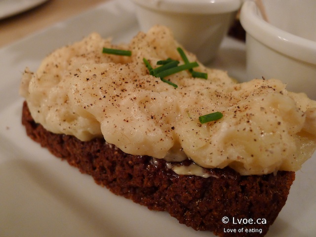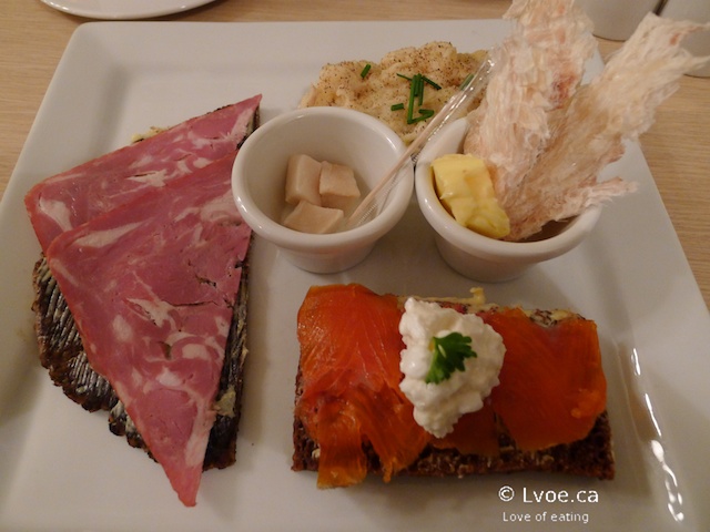 The trout has a strong smoky flavour and aroma. I put together perfect bites of this with a little trout, bread and cottage cheese(?) The smoked taste works very well with the rye bread, and the trout is very bite-through-able. Café Loki makes all of their breads from scratch, and my platter had three different thicknesses of rye bread on it. The trout was on the medium thickness bread.