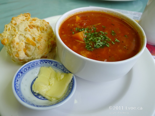 I had a flat-mate years ago that cooked religiously from the Moosewood Cookbook. My favourite soup from it was the Spicy Tomato Dill, with Gypsy being a close second. The Smörgåsbord's version of Gypsy soup is lovely. It is tomato based with carrots, chick peas, onions, celery and bell peppers. This is a very hearty vegetable soup, with a touch of spice. The soft and slightly flakey cheese biscuit is the perfect accompaniment.