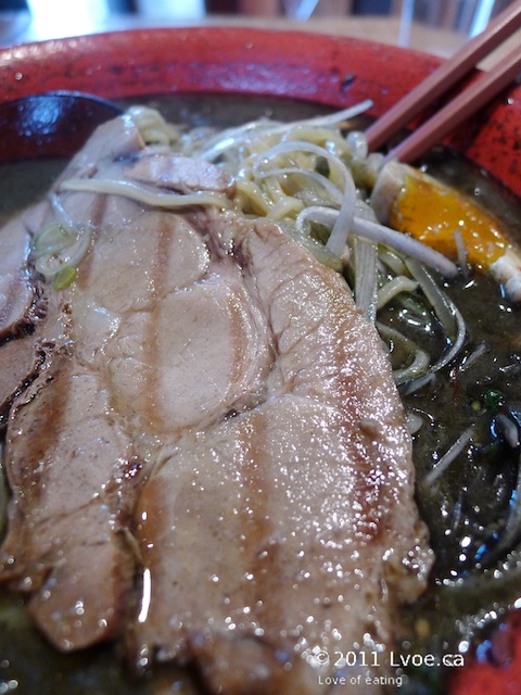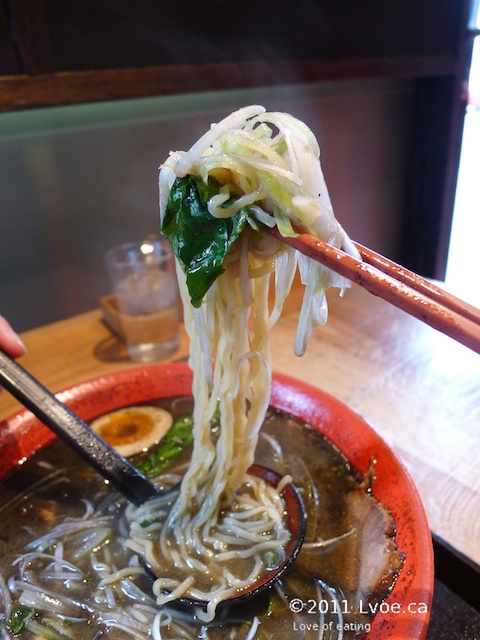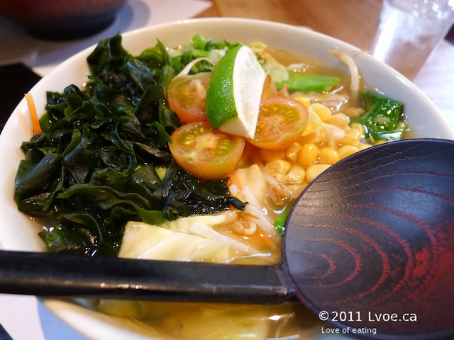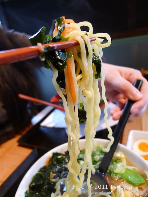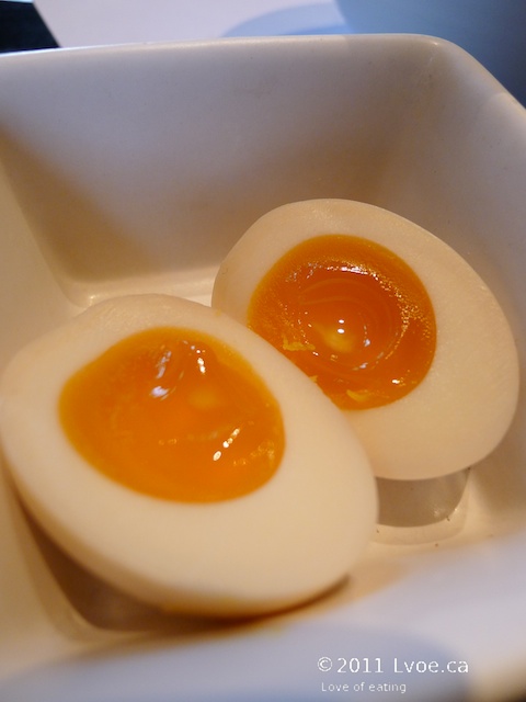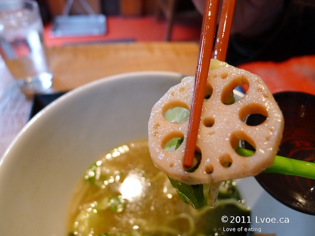 The broth again is light in flavour and body. There is a fair amount of sesame oil floating about on the surface, which coated the noodles nicely before heading into my belly. The vegetables are fresh and vibrant, there is even some lotus root hiding at the bottom too. Since this bowl is all vegetables, an order of egg is required to round out my ramen lunch.